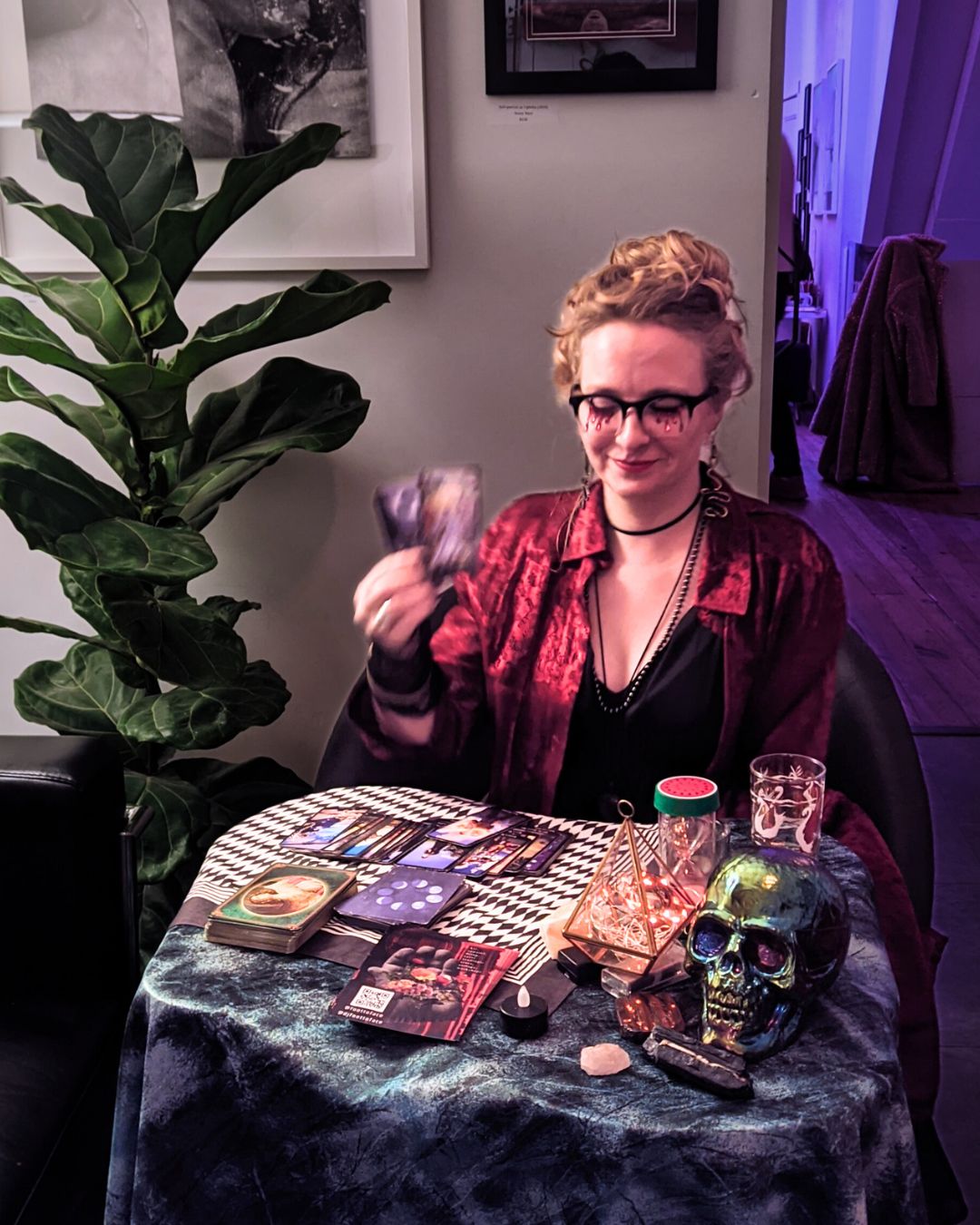 • Promotional sign for a tarot reading event with text and graphics on a pink background. Text reads: Tarot Time! Get a quick tarot reading by Julianne (look for the shape-studded headband to find your oracle). * Be sure to find her before 9:30pm when she will shape-shift into a DJ! *